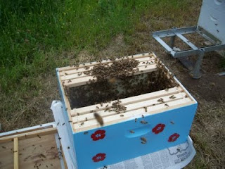 Mark called me to talk through what to do, and we decided to try to combine this vast new swarm with Hive 4, which has struggled for a while. We've been unable to locate a queen close enough to the route Mark plans to take to pick up equipment, so this will -- if he was able to capture the queen -- get Hive 4 up and going again. To learn about combining hives using the newspaper method and bees' ability to shape wood, visit The Peace Bee Farmer.